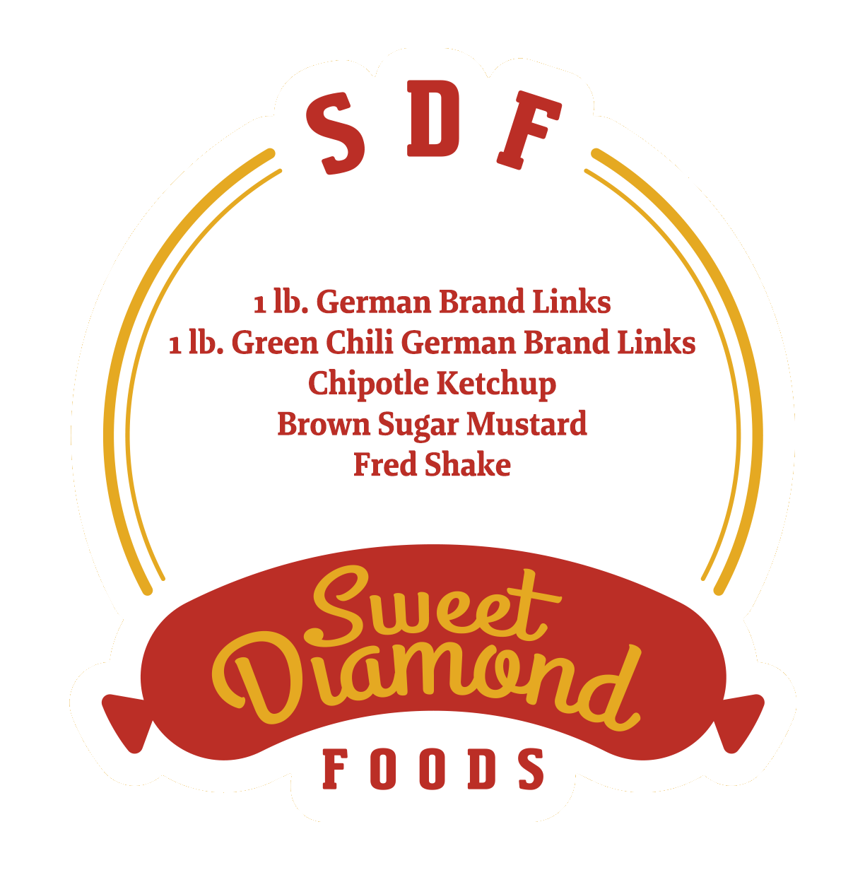 1 lb. German Brand Links, 1lb. Green Chili German Brand Links, Chipotle Ketchup, Brown Sugar Mustard, Fred Shake